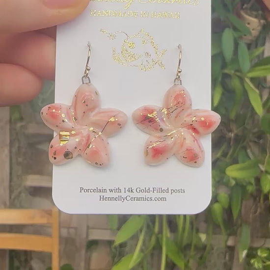 Handmade porcelain plumeria earrings with 22k gold flecks. Earring wires are 14k gold fill.